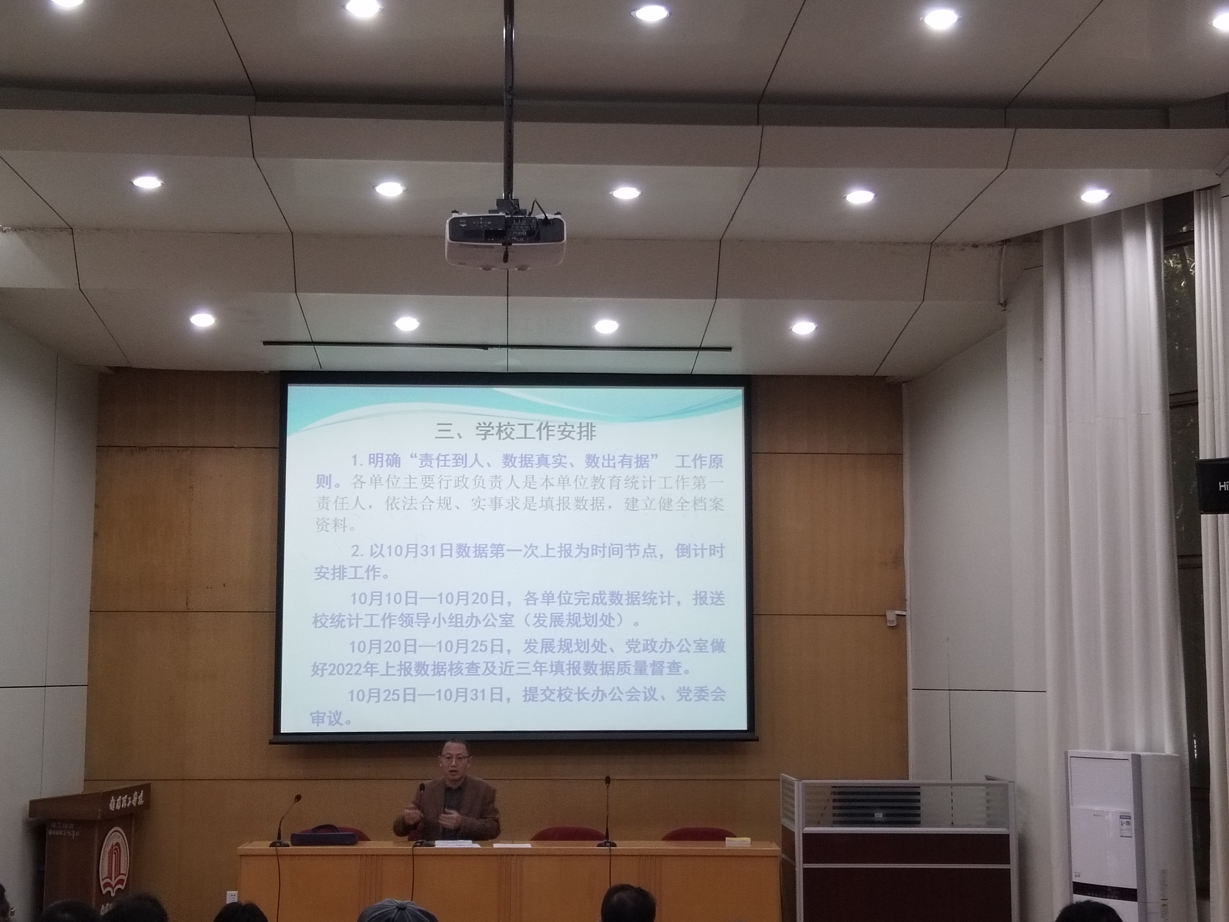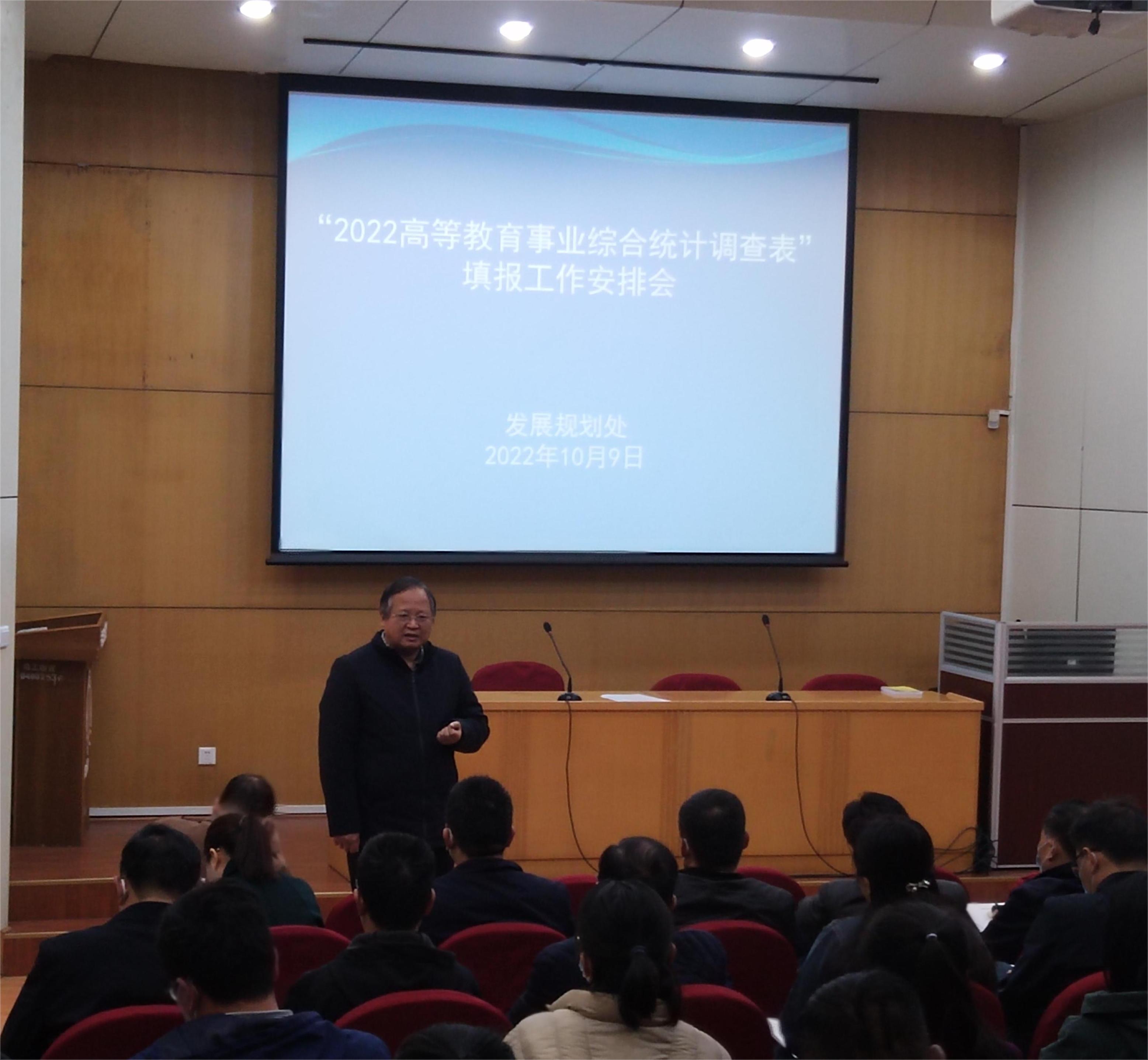 本网讯(特约记者/杨博竣)2022年10月9日上午,我校在中込会馆报告厅召开2022年度教育事业综合统计工作安排会,副校长张世海出席讲话,发展规划处主持,党政办公室、党委组织部、人事处、教务处、学生处等27个综合统计工作相关部门负责人和统计员参加。