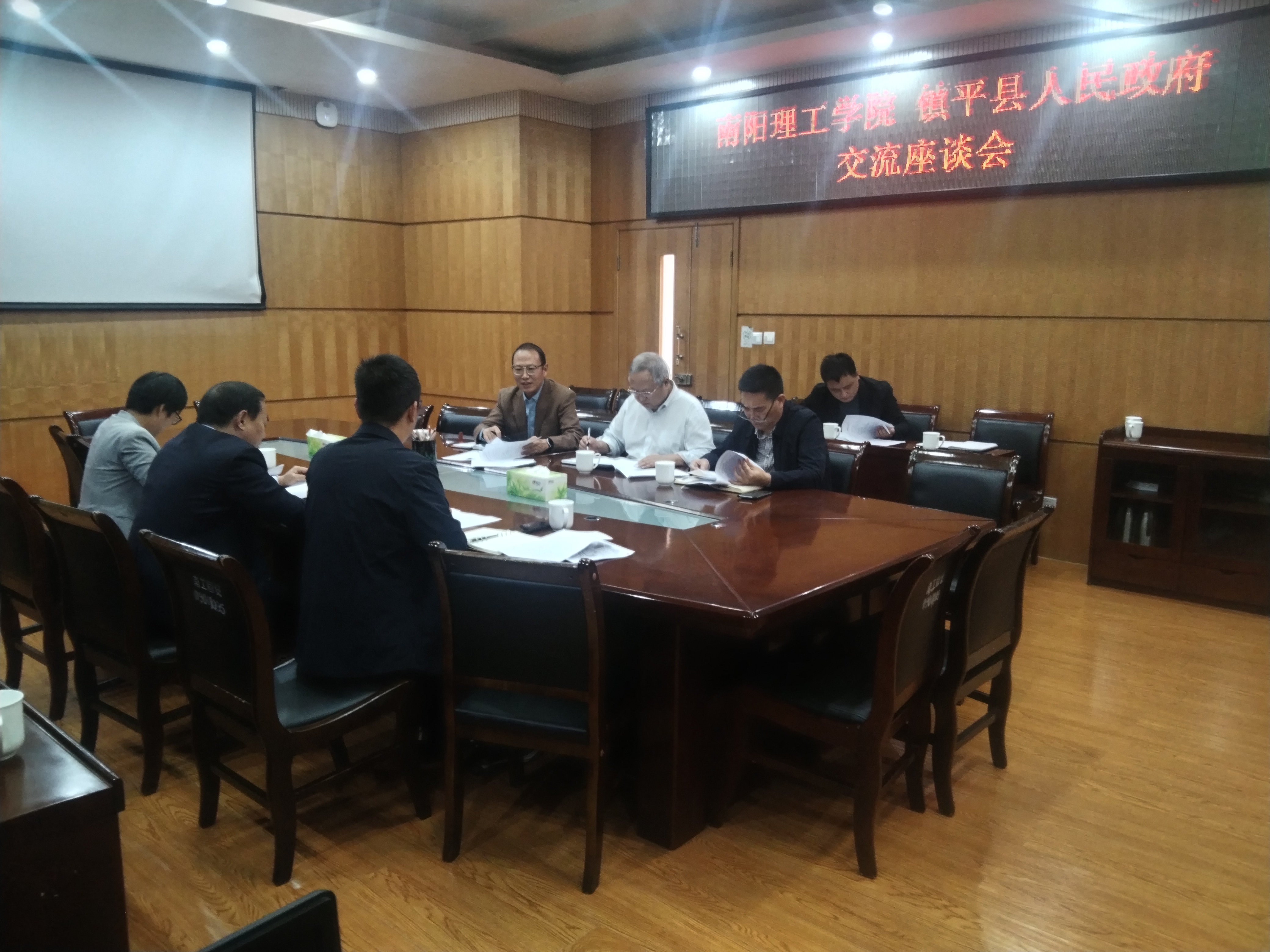 镇平县聚鑫产业发展有限公司、镇平县政府法制办公室负责人,我校发展规划处、依法治校办公室负责人一同座谈。(校对/杨博竣 审核/徐文华)