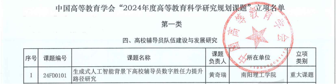 近日,中国高等教育学会公布“2024年度高等教育科学研究规划课题”立项名单。南阳理工学院3项课题获得立项资助,其中黄奇瑞主持的《生成式人工智能背景下高校辅导员数字胜任力提升路径研究》获批高校辅导员队伍建设与发展研究类重大课题。