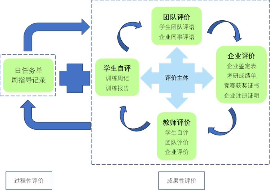 过程性评价中的“日任务单”注重学生良好学习和工作习惯的养成,评价学生制定工作计划及执行计划的能力,“周指导记录”注重对学生整个训练过程的监督和管理,由校内导师与学生、企业导师沟通后记录完成;成果性评价强调评价主体对训练成果产出的鉴定和总评,其中“学生自评”以训练周记和训练报告呈现,团队评价以项目组成员互评为主,企业评价以企业鉴定、考研成绩等为依据,教师评价则由校内导师对周指导记录、学生自评、团队评价、企业评价综合评分。